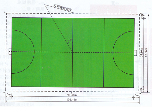 曲棍球場(chǎng)地四周設(shè)有無(wú)障礙區(qū),在障礙區(qū)域內(nèi)絕對(duì)不允許裝設(shè)燈桿,燈塔。無(wú)障礙區(qū)域最小為:距兩底線5m,距兩邊線4m。
