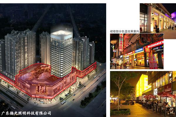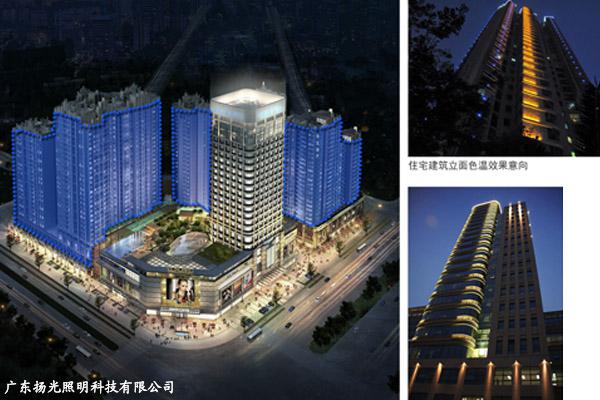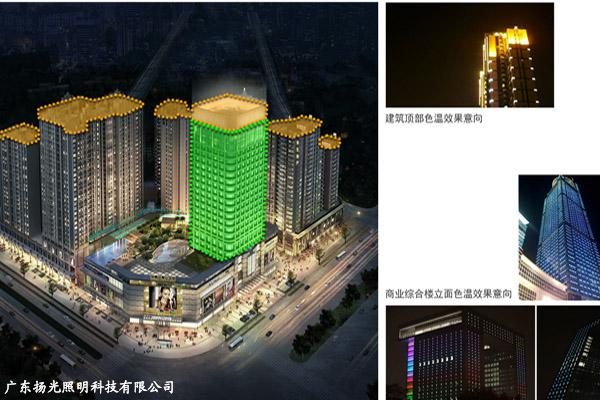 商業綜合樓立面面對著人流量較多,是燈光靚現的重要區域。色溫可選用暖黃或彩色光體體現現代時尚感。