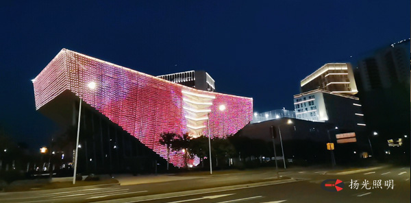 其中的展示中心是穿孔板幕墻結(jié)構(gòu),采用RGB相素點(diǎn)內(nèi)藏其中,通過(guò)控制相素點(diǎn)燈形成動(dòng)態(tài)變化視頻屏幕,從而帶來(lái)視覺(jué)沖擊力的燈光效果。辦公區(qū)建筑立面幕墻設(shè)置有豎向遮陽(yáng)板,擋板鱗次櫛比地排列,為建筑特色結(jié)構(gòu)設(shè)計(jì)。在擋板的下方,設(shè)置暖白光色洗墻燈,燈光將結(jié)構(gòu)洗亮,通過(guò)檔板的反射,讓燈光變得柔和、輕盈。