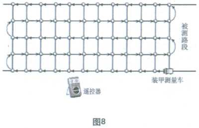 本方案是將具有記憶和存貯功能的TES-1333型照度記安置在高檔電動遙控的履帶式玩具裝甲車(以下簡稱為測試小車)上,該測試小車的驅動系統受站在路邊的測量者手中的遙控器和測試小車內安置的可編程控制器為主體的自動控制系統控制,當車內的自動控制系統啟動時,裝甲車將按照事先設定的動作程序沿如圖8所示的箭頭方向完成行走程序,并采用四點法在每個矩形網格的四角處自動完成照度測量和記錄,存貯任務,待全部程序結束后,測試小車在遙控器的操縱下自動返回測量者所在位置。遙控器的另一作用是在車內控制系統失靈的情況下,由測量者手動遙控完成全部的測量過程,并在道路出現行駛車輛時緊急召回測試小車。