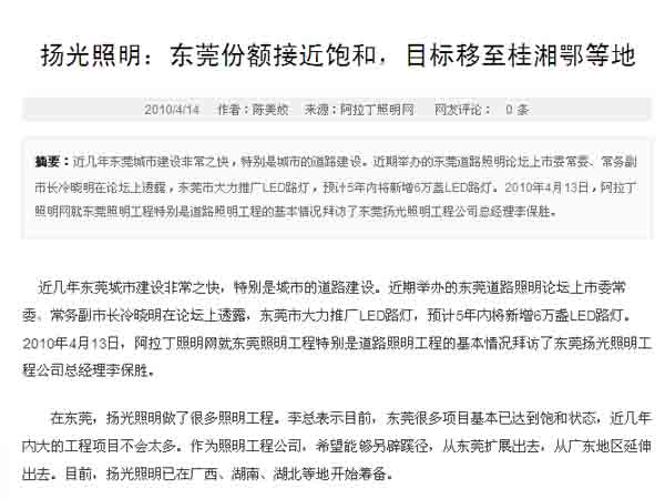 在東莞,揚光照明做了很多照明工程。李總表示目前,東莞很多項目基本已達到飽和狀態,近幾年內大的工程項目不會太多。作為照明工程公司,希望能夠另辟蹊徑,從東莞擴展出去,從廣東地區延伸出去。目前,揚光照明已在廣西、湖南、湖北等地開始籌備。